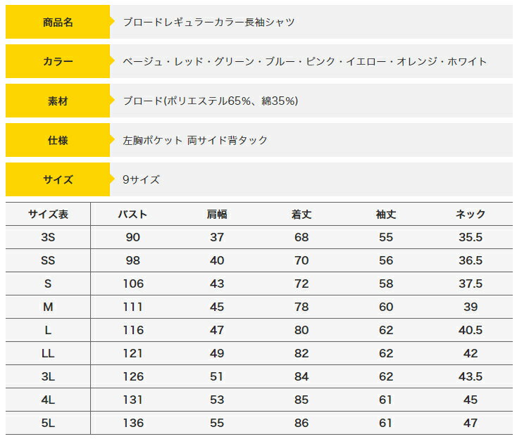 商品名 ブロードレギュラーカラー長袖シャツ カラー ベージュ・レッド・グリーン・ブルー・ピンク・イエロー・オレンジ・ホワイト・ブラック・パープル 素材 ブロード(ポリエステル65%、綿35%) 仕様 左胸ポケット 両サイド背タック 発送について お買い上げ合計10,000円以上で送料無料! ※メーカー在庫商品の為在庫切れの場合がございます。